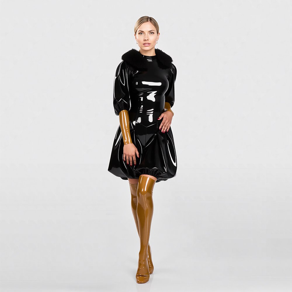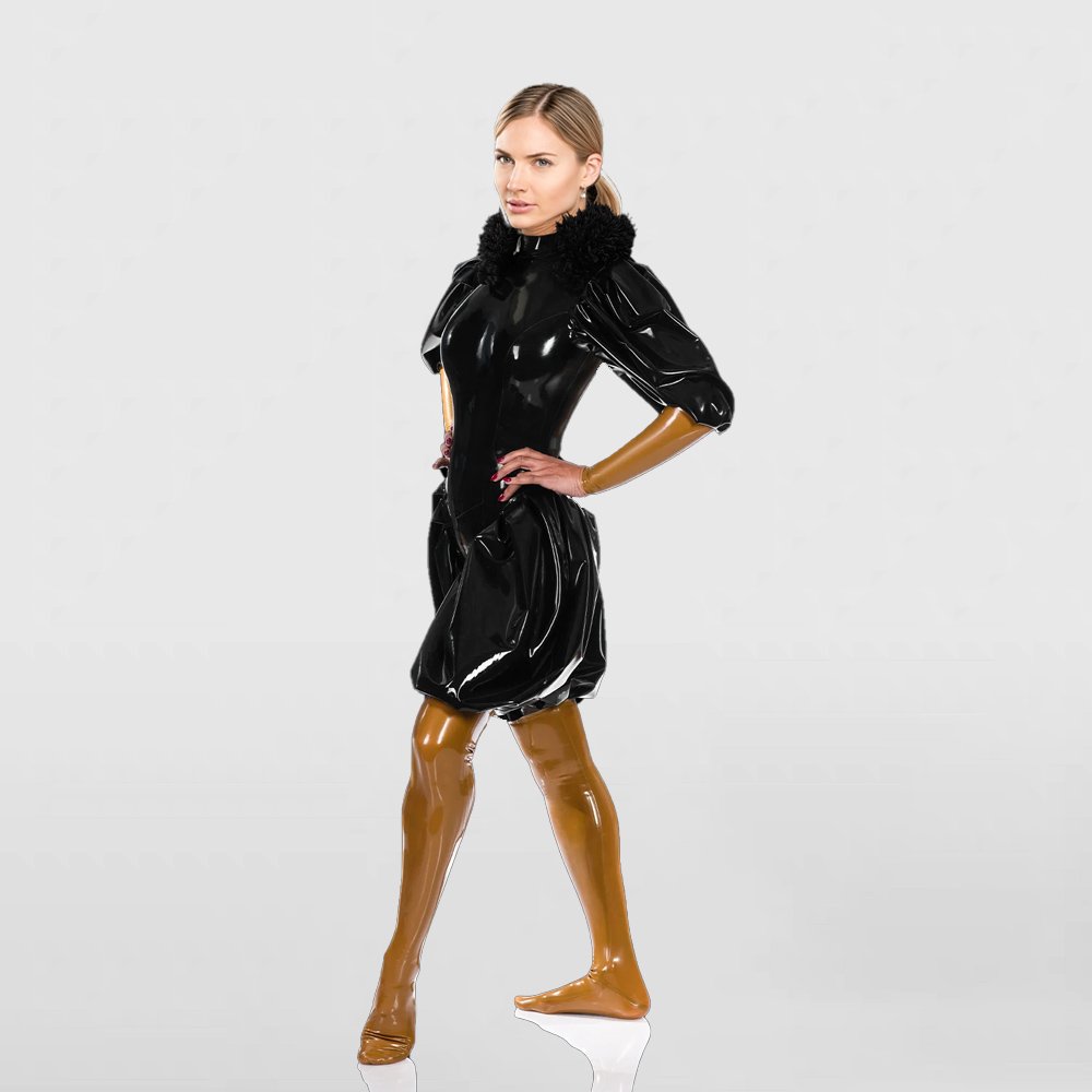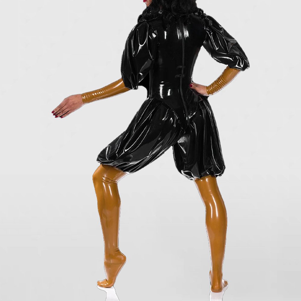 Black Puffy Pleated Latex Catsuit – Women’s Tight-Fit Dominant Bodysuit