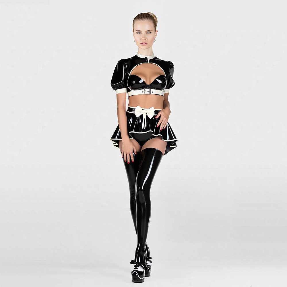 • This five-piece latex ensemble redefines “sweet-meets-edgy” aesthetics through a classic black-and-white palette and playful detailing. The set features a puff-sleeved shrug with an alluring chest cutout, a supportive glossy bra, matching panties, and a pleated mini skirt adorned with a delicate bow, all anchored by sleek thigh-high stockings. The crisp white piping acts as a visual highlight, accentuating the layered silhouette and blending retro elegance with avant-garde flair—a creative masterpiece designed for both ritual and high-impact style.