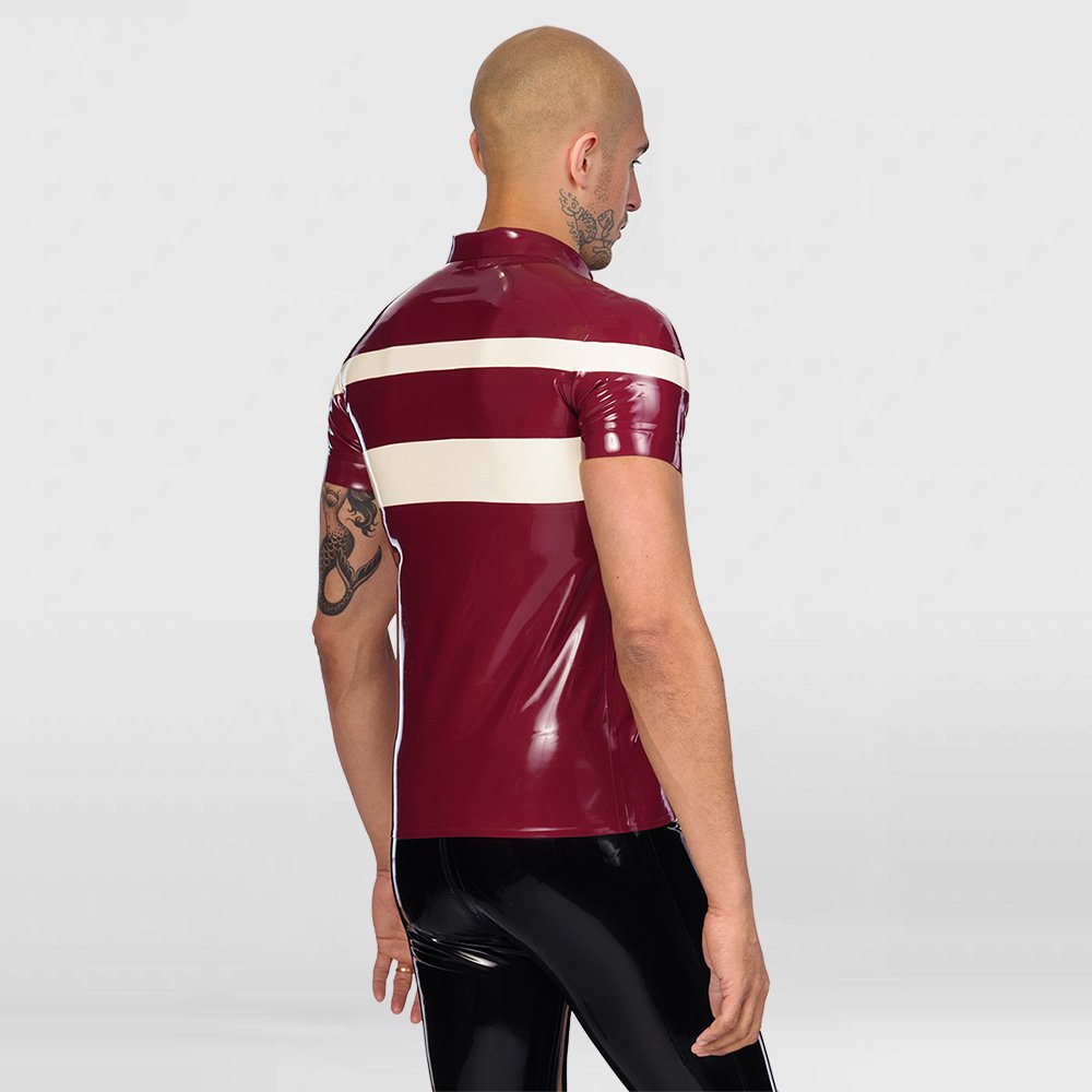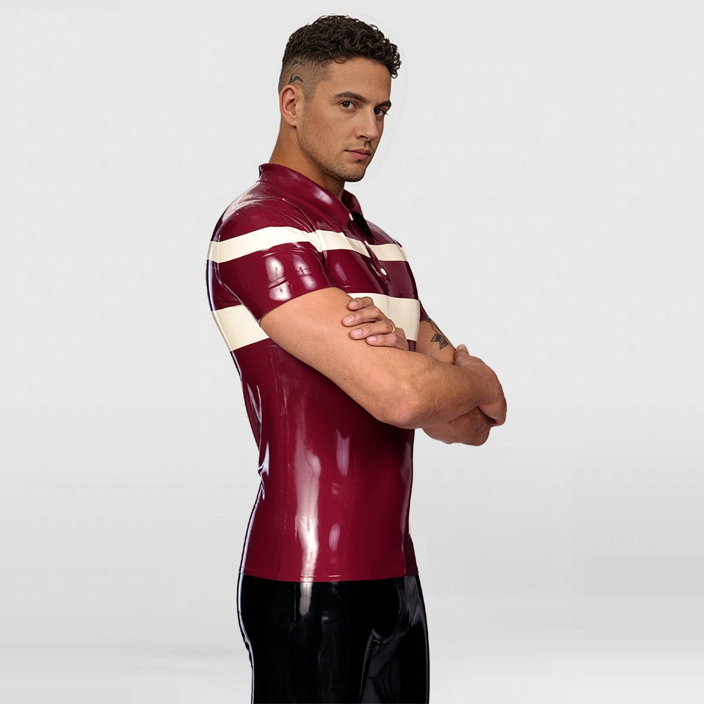 • This men’s latex polo shirt captures the fresh, youthful vibe of a college student, combining style and playful charm. The seams are reinforced for durability, while the contrast stripes highlight a classic collegiate aesthetic. As shown in the main image, the body of the shirt is presented in the main color, with the white stripes serving as the secondary color.