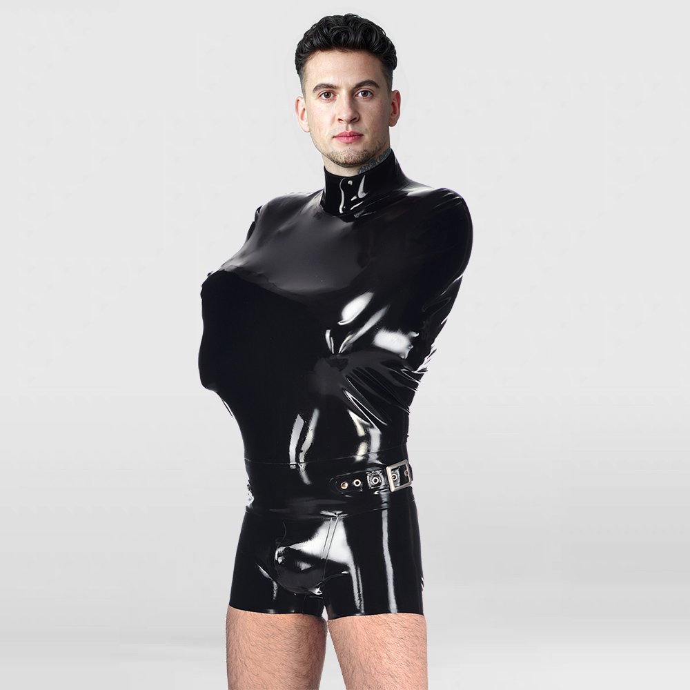 LATEX TOP MEN’S SOLID COLOR BACK ZIPPER ARM RESTRAINTMen’s Latex Top – Sleeveless Solid Color with Back Zipper and Arm Restraints, Submissive Fetish Look
