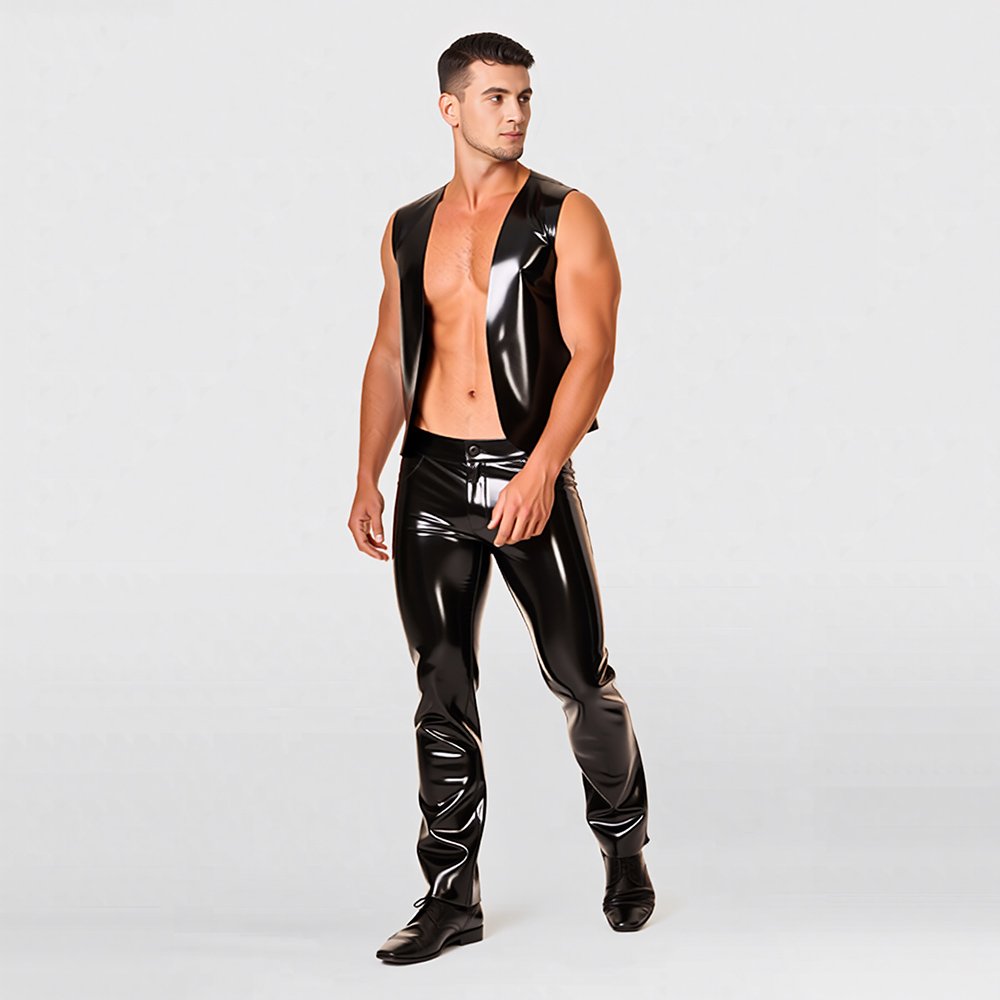 • This men’s open-front latex vest is designed with a clean, minimalist look, featuring a smooth surface that fits closely to the body. Two wide inner pockets on both sides add practical storage without compromising the sleek silhouette. Available in a wide range of color options, it delivers a stylish, confident appearance that is easy to match with different outfits.