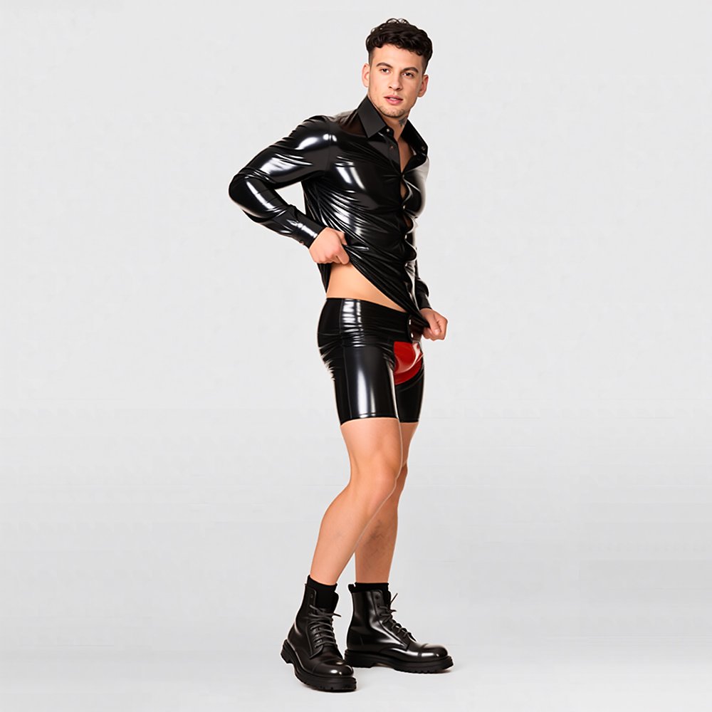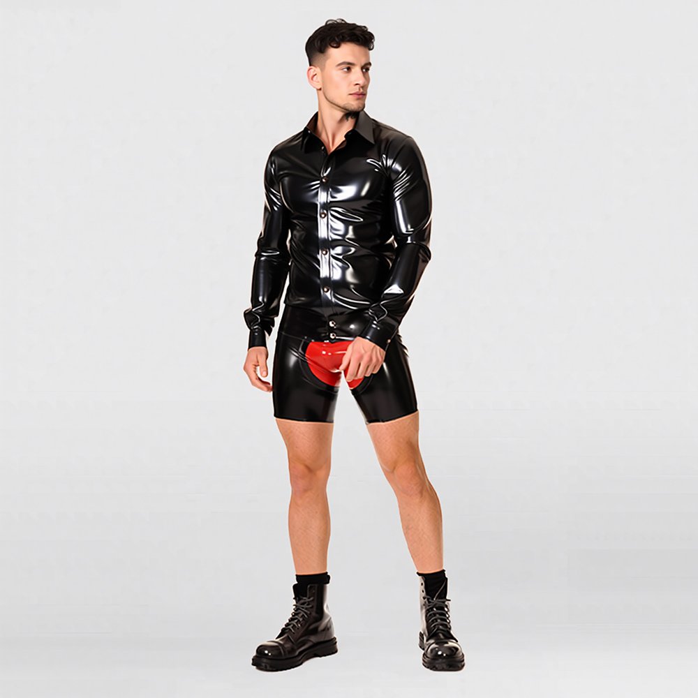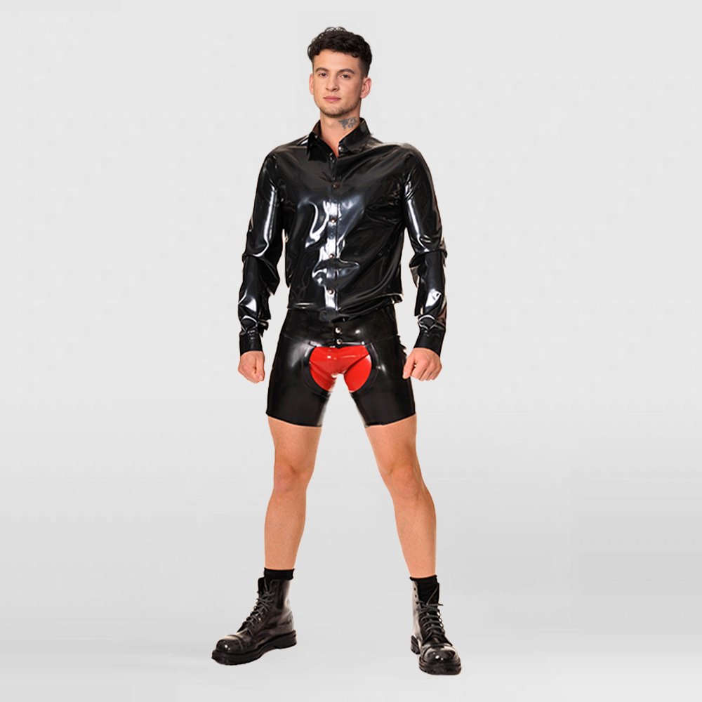 • These latex shorts feature a slim, form-fitting cut with a fully open-crotch design for comfortable wear and improved breathability. The snap-button waistband allows for quick and easy on-and-off, and if you like, you can also layer a red latex brief underneath as shown on the model, creating an even more striking and visually bold look.
