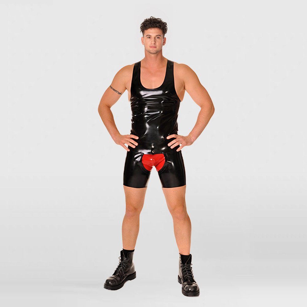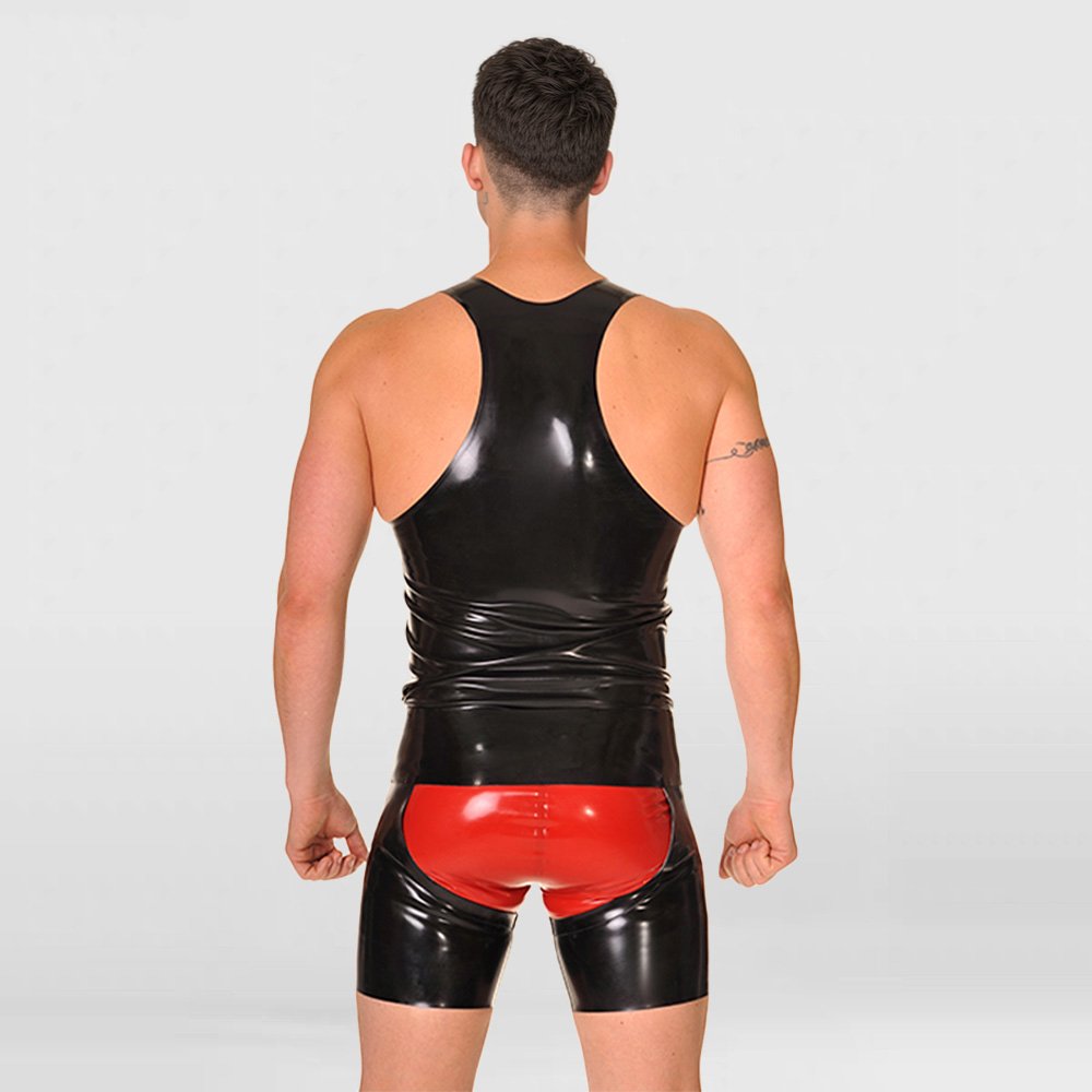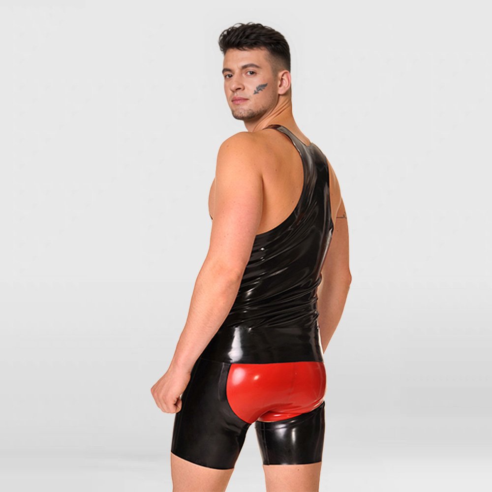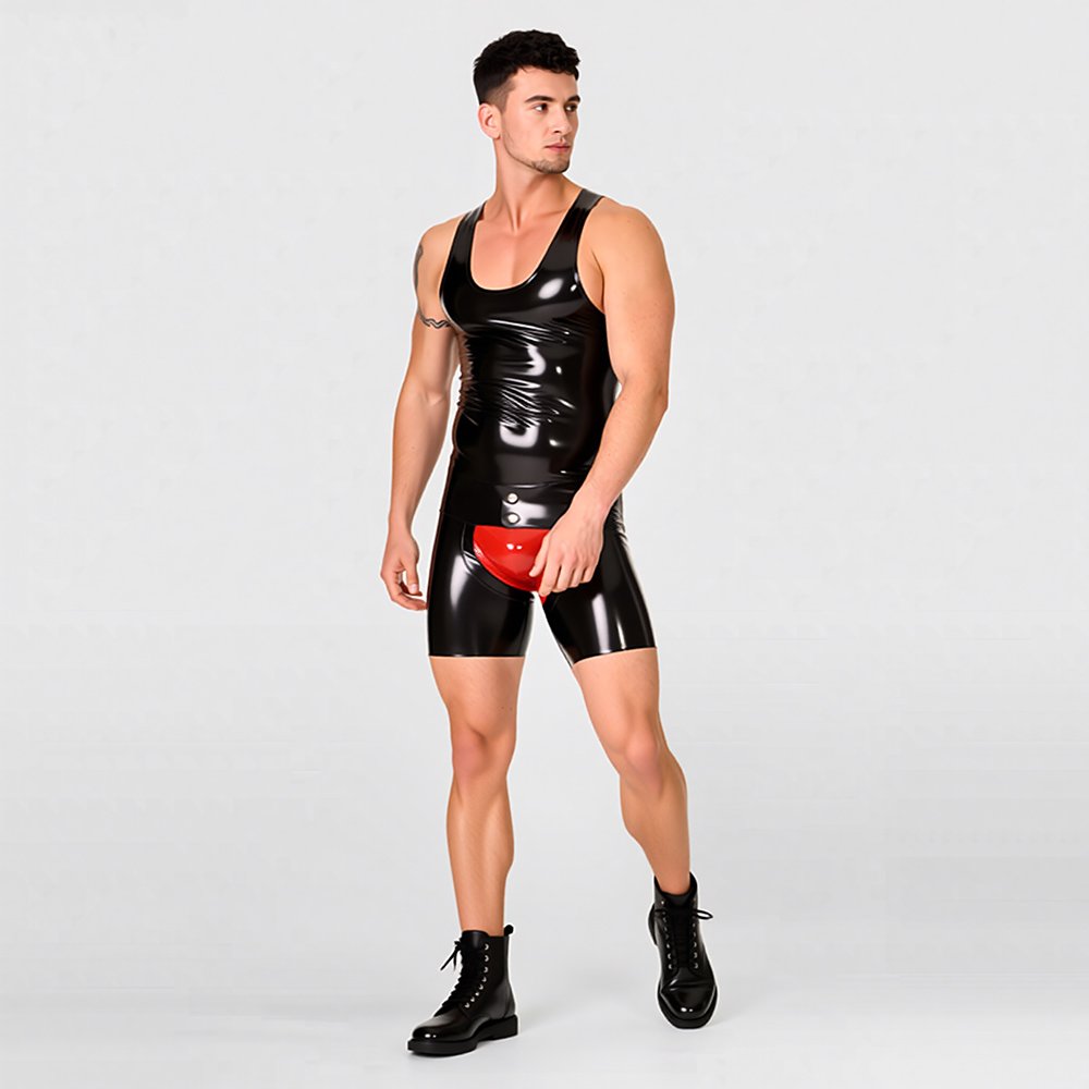 • These latex shorts feature a slim, form-fitting cut with a fully open-crotch design for comfortable wear and improved breathability. The snap-button waistband allows for quick and easy on-and-off, and if you like, you can also layer a red latex brief underneath as shown on the model, creating an even more striking and visually bold look.