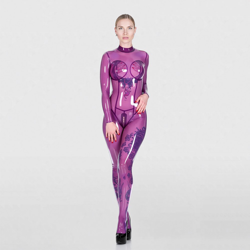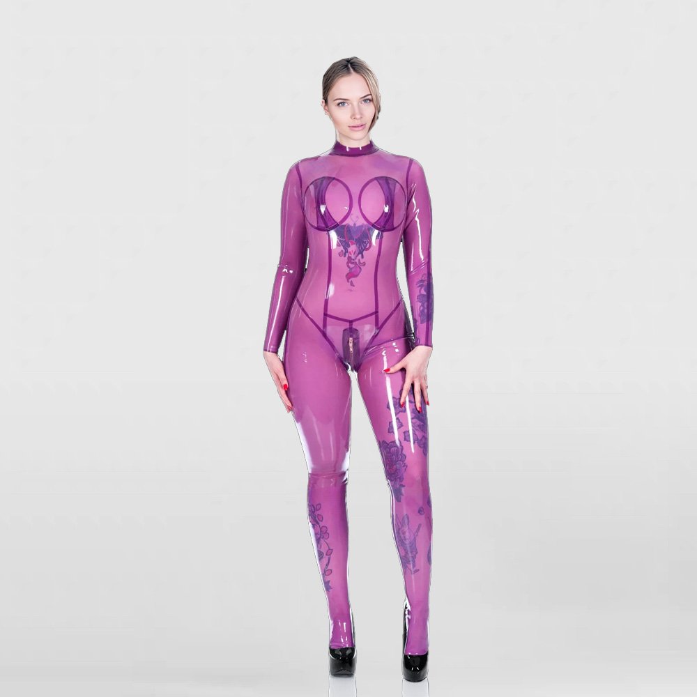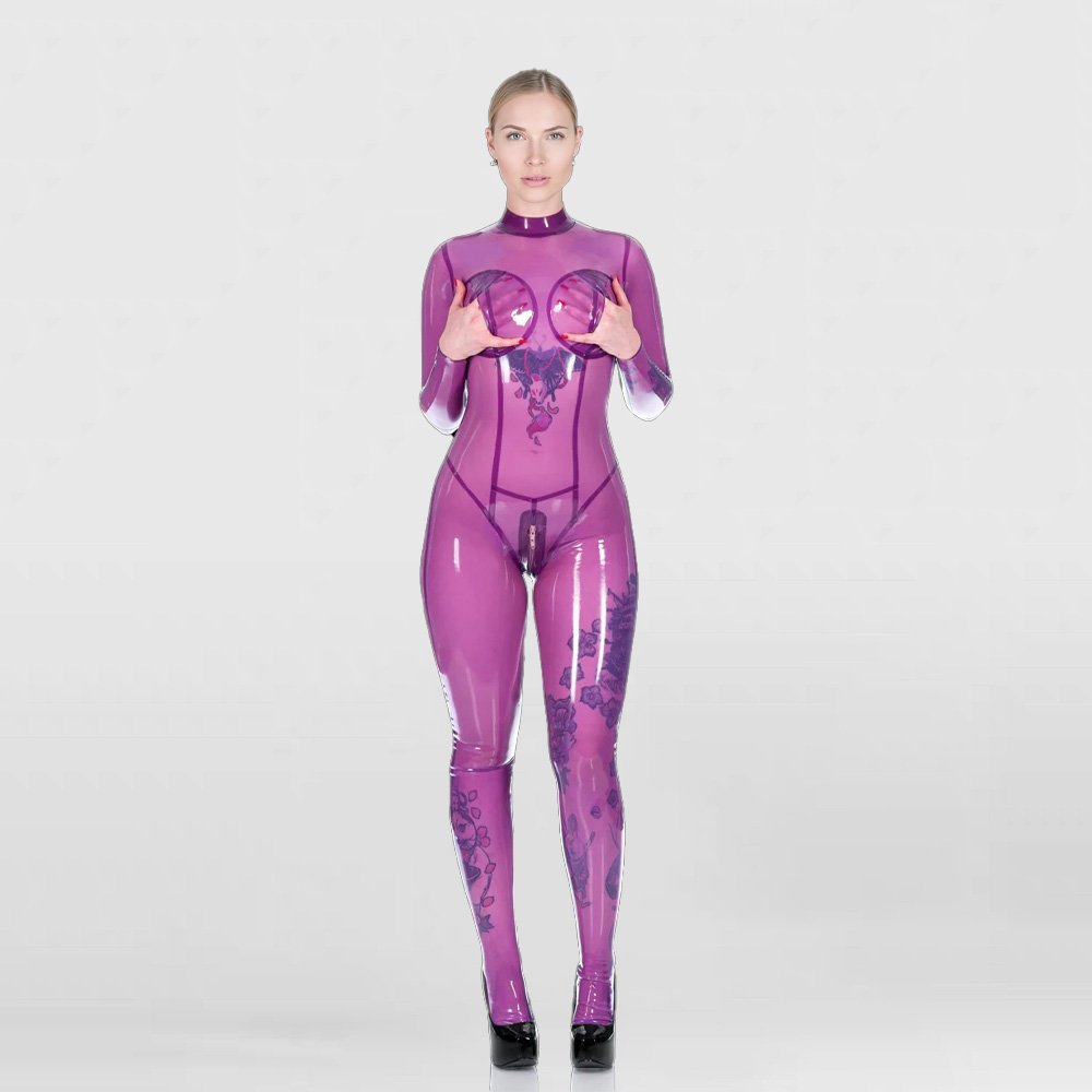 • This semi-transparent lavender latex catsuit masterfully fuses ethereal hues with a daring, futuristic design. The unique full-coverage silhouette, paired with provocative circular breast cut-outs, artfully contours the body beneath a captivatingly translucent finish. Its structured high-neck and long-sleeve upper balance the minimalist lines of the lower body, while the high-gloss material reflects a high-tech, liquid-like luster. It is the definitive choice for the avant-garde, seeking the pinnacle of individual expression and sensory aesthetics.